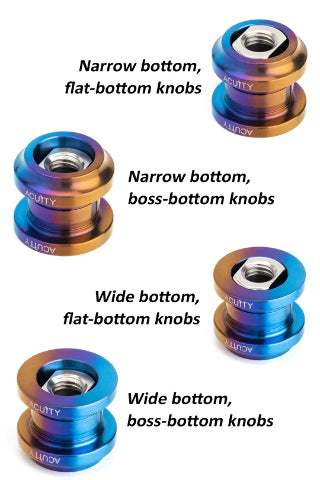 We are very pleased to introduce our V2 Burnt Titanium Shift Boot Collars, now featuring an anodized finish for an updated appearance and improved color consistency from part to part. These feature all of the benefits of our other 1924 shift boot collars, plus billet 6Al-4V Titanium with a beautiful blue-purple-gold anodized finish. Gone are the days of sagging shift boots, broken plastic shift boot collars, and shift boot collars that don't match the diameter or style of your shift knob. ACUITY designed this Shift Boot Collar Upgrade to allow the use of virtually any M10x1.5 shift knob in your Honda without sacrificing fit and finish between the shift boot and shift knob. This kit includes 2 binding nuts, one meant for flat-bottomed knobs, and the other meant for boss-bottomed knobs (like modern Civic Type R and Honda Factory Performance designs). The boot collar is reversible and can be flipped to match your knob's base diameter, whether it be a traditional narrow-bottomed knob (with a 22mm lower diameter) or the newer style wide-bottomed knobs (with a 28mm lower diameter). An integral retaining feature lets you easily pop the boot collar on and off many times without problems, so you no longer have to worry about breaking the OEM plastic boot ring when removing your shift knob. The supplied binding nuts are turned and milled from stainless steel and have flats for a 12mm open-ended wrench.