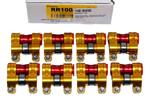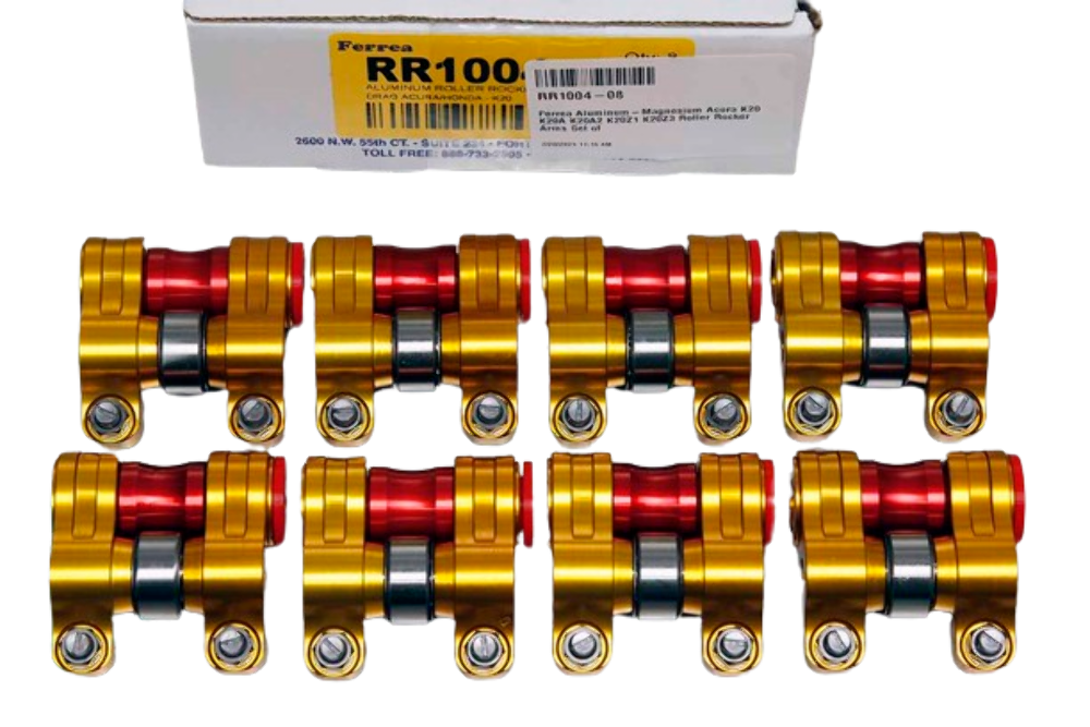 Upgrade your Acura/Honda K20 engine with the Ferrea Aluminum-Magnesium Roller Rocker Arm Set (Part #RR1004). Designed for 2nd Gen K20, K20A, and K20Z1 motors, these precision CNC-machined rocker arms handle over .650” lift at 11,000 RPM, making them ideal for high-lift, high-performance builds.