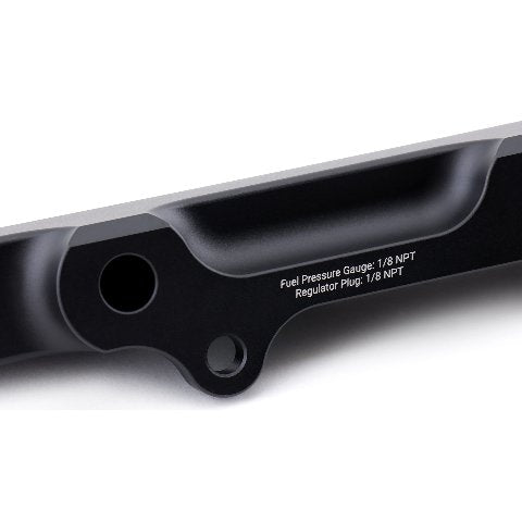 Each rail includes a 1/8" NPT hole that allows you to mount a fuel pressure gauge directly to your fuel rail. This puts the fuel pressure gauge in a spot that's easily visible, so you don't have to poke around in the engine bay just to see if you have fuel pressure. All of the ports can accept a -8 ORB fitting in the inlet(s) and outlet allowing you to run either the OEM B-Series FPR or use the supplied 1/8th NPT plug and use the side -8ORB port.