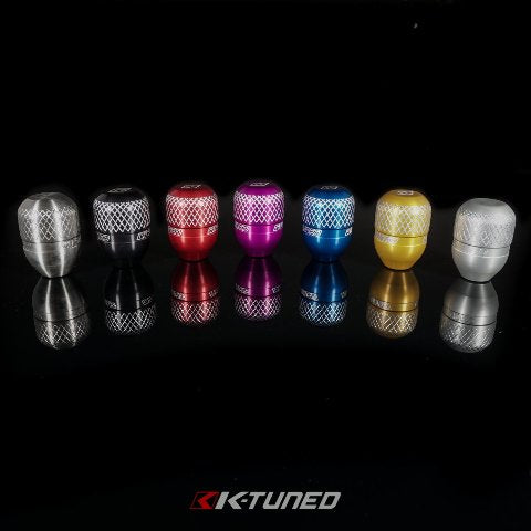 The K-Tuned Billet Shift Knob is the result of quite a bit of customer and racer feedback. We already offer several K-Series shifter upgrades so it was definitely time for us to develop a clean and functional shift knob. The process begins with a solid billet bar of 6061 aluminum, and each knob is machined to final size on a CNC lathe. After the lathe, the blank knobs are sent out for the anodizing process. The black is hard anodized and the colors are regular anodized. During the final step, each knob is chucked up on a 4-Axis CNC mill to precision cut in the unique grid pattern that was designed to improve shifter grip. This final step is so critical that we actually have a 5% scrap rate. On cable shifter setup we found that a weighted knob can cause shifting problems for some drivers because the neutral return spring has to work harder to pull the shifter back to the center. So instead of going to the heavy side we found a good weight (5.5 oz) that is just enough to allow confident and accurate shifting while still keeping enough weight to help the front to back shifts. Shift knobs are finished in a variety of colors with our K-Tuned logo on two sides. On top we engraved our signature K logo. A custom made jam nut is included to keep the knob locked in place. This knob is a great way to finish off any shifter setup.