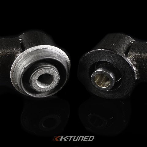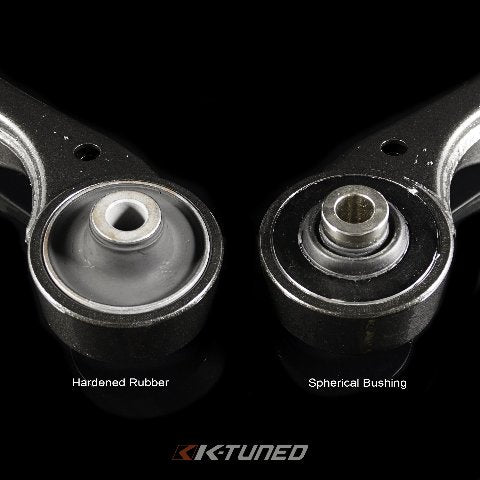 Replacement front control arms with hardened rubber bushing or spherical bushing. Unlike OEM we use a full bushing to give increased rigidity and strength. Hardened rubber bushing is best for street cars. Spherical bushings best for high hp setups and race cars.