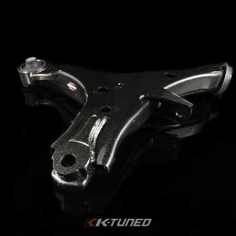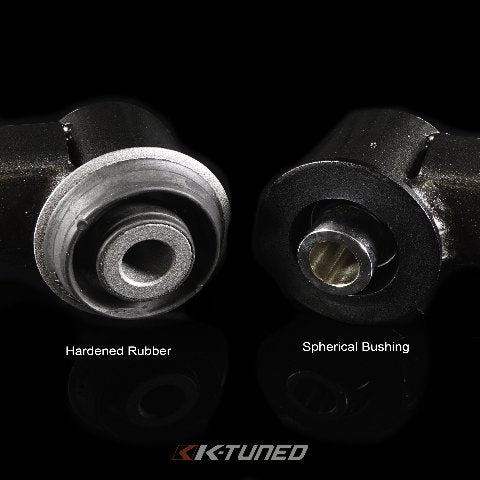 Replacement front control arms with hardened rubber bushing or spherical bushing. Unlike OEM we use a full bushing to give increased rigidity and strength. Hardened rubber bushing is best for street cars. Spherical bushings best for high hp setups and race cars.