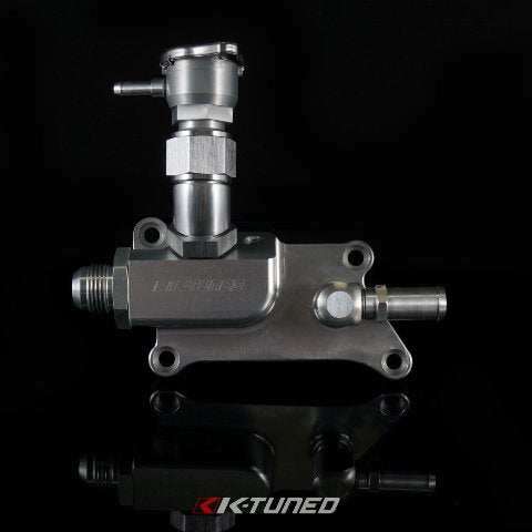 Feature: a -16OR (O-Ring) Outlet and a -12OR (O-Ring) Filler Inlet Here is the K-Tuned Upper Coolant Housing. With applications for both K20 and K24 engines, these housings will provide several unique advantages over the stock units. The hose outlet on the K-Tuned housing pivots slightly, allowing approximately 15 degrees of angle adjustment. This is helpful when compared to the fixed the factory outlet that always seems to put the upper rad hose in the path of the intake piping. There are three available hose outlets to work with any radiator hose setup. Choose the standard 1.25" rad hose outlet for use with regular rubber or silicone rad hoses. Switch to our optional 12AN or 16AN fittings for use with upgraded hose and fittings that are also available from K-Tuned. We have also designed an optional Filler Neck that can be used to relocate the radiator cap to a higher point on the engine itself. The new location is the highest point of the cooling system and allows air pockets to easily escape during the coolant bleeding process. The optional Filler Neck is also available with standard 1.25" hose or in 12AN and 16AN sizes and was designed for use with an OEM 92-00 Honda Civic radiator cap. This part will be very helpful on an engine that already has a bad reputation for coolant bleeding. The K-Tuned Upper Coolant Housing will compliment our Swivel Neck Thermostat and our Water Pump Block off Plate. All of these parts allow plenty of options for custom and race engine cooling setups.