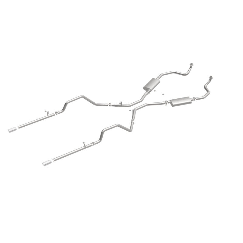 The MagnaFlow 1961-1964 Chevrolet Impala Street Series Crossmember-Back Performance Exhaust System 16724 brings enhanced engine sound and dyno-proven performance to your 3.8L, 4.6L, 5.3L, 5.4L, 5.7L, 6.7L, 7.0L 1961-1964 Chevrolet Impala with a healthy helping of our deep, resonant signature exhaust note at Moderate exterior and Mild interior sound levels. Thanks to its durable, corrosion resistant stainless steel design, this Chevrolet Impala exhaust system will handle whatever tarmac you decide to leave your mark on. This performance exhaust kit features a crossmember-back layout designed to replace your Chevrolet Impala's exhaust system from the crossmember on back. With its fast-flowing, mandrel bent 2.5in. main piping and 2 Straight-Through mufflers ending in a Dual Split Rear exit with 3in. Polished Welded-On Single Wall Angle Cut Rolled Edge tips, your muscle car will be sounding as awesome as it looks. Extensive 3D scanning during development has resulted in a direct-fit design that you can easily install yourself. 16724 is produced using CNC precision robotic manufacturing techniques and is backed by MagnaFlow's limited lifetime construction warranty.This Part Fits: