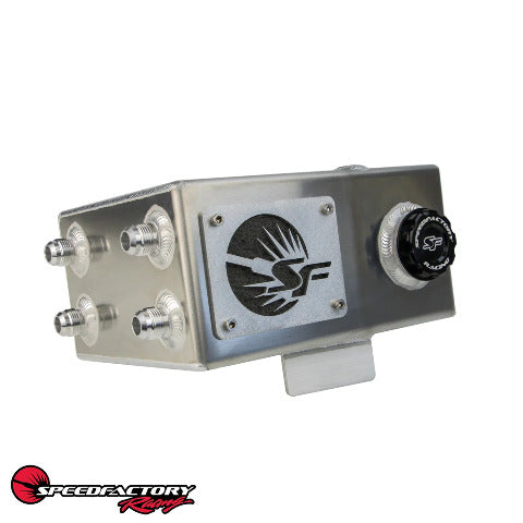 The SpeedFactory Racing Right Hand Drive Angled Oil Catch Can with built in Coolant Overflow Tank is specifically designed for forced induction and heavily modified naturally aspirated engines. This breather setup is engineered to provide the sufficient crankcase ventilation your high performance engine needs, and also condenses crankcase blow-by oil and moisture correctly.The factory PCV system is replaced and all oil vapors are vented to the atmosphere through the laser cut logo. The integrated coolant overflow tank saves precious engine bay space and replaces the unsightly factory plastic unit.